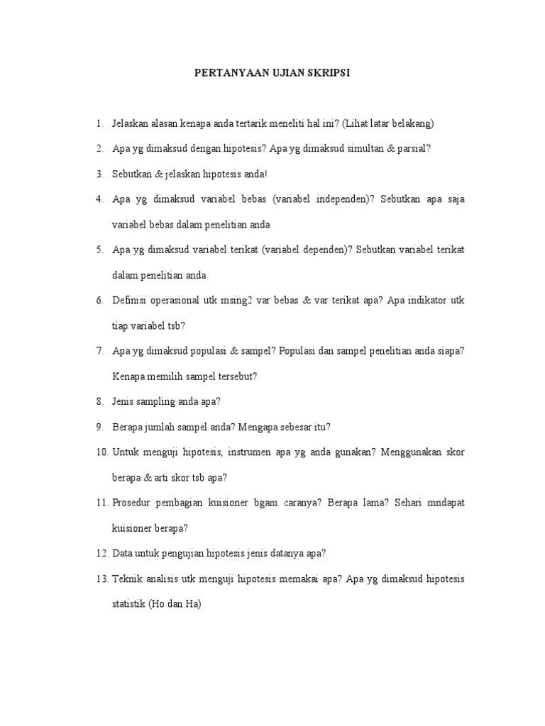 Diceritaken (dengan gaya dalang parto) ada seorang mahasiswa tampan dan gagah berani hendak menjalani sidang proposal skripsi. Judul skripsi/penelitian ketika kamu ditanya apa judul skripsimu diusahakan menjawab jelas dengan penuh percaya diri diusahakan dengan suara alto, jika kamu hafal judulnya bagus, tapi jika kamu tidak hafal kamu bisa membacanya di booklet pegangan kamu disaat sidang. Demikian daftar pertanyaan sidang skripsi yang sering ditanyakan oleh dosen penguji dan pembimbing skripsi pada saat sidang skripsi berlangsung. Ini adalah 21 pertanyaan substansial skripsi yang kemungkinan besar akan ditanyakan saat sidang.list pertanyaannya dapat. Sidang skripsi menjadi momok paling mengerikan bagi mahasiswa, apalagi tanpa persiapan. Read pdf skripsi pengaruh motivasi dan pengalaman kerja terhadap. Daftar pertanyaaan dan jawaban sidang skripsi lengkap. Oleh godhongkemangi, posted in belajar, tips dan trik. Daftar pertanyaan sidang skripsi yang paling sering diajukan ini akan membantu anda.