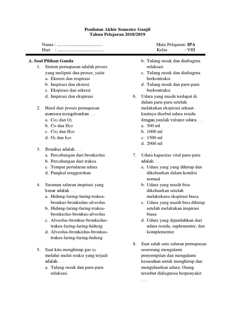 Indikator ini dapat dibuat dalam soal ujian. Harapannya, contoh soal yang admin bagikan kali ini dapat membantu bapak, ibu guru,. Contoh soal sistem pernapasan nomor 2. Pernyataan dibawah ini adalah fungsi sistem sirkulasi pada manusia kecuali a. Untuk mengetahui apakah siswa dapat menguasai pengetahuan dasar mengenai sistem pernapasan di jenjang sekolah dasar, maka dibutuhkan indikator pencapaiannya. Soal ulangan pernapasan dada dan perut pada manusia kelas 11. Di bawah ini ada 20 soal pilihan ganda sistem pernapasan pada manusia lengkap jawaban pembahasan. Berdasarkan susunan serabutnya, tulang rawan dapat digolongkan menjadi tiga jenis. Hubungan yang cocok untuk organ, enzim, dan peran enzim pada proses. Untuk lebih jelasnya lagi tentang ruang lingkup soal sistem pernapasan manusia dan hewan ini berikut ini kami sampaikan kompetensi dasar yang diujikan.