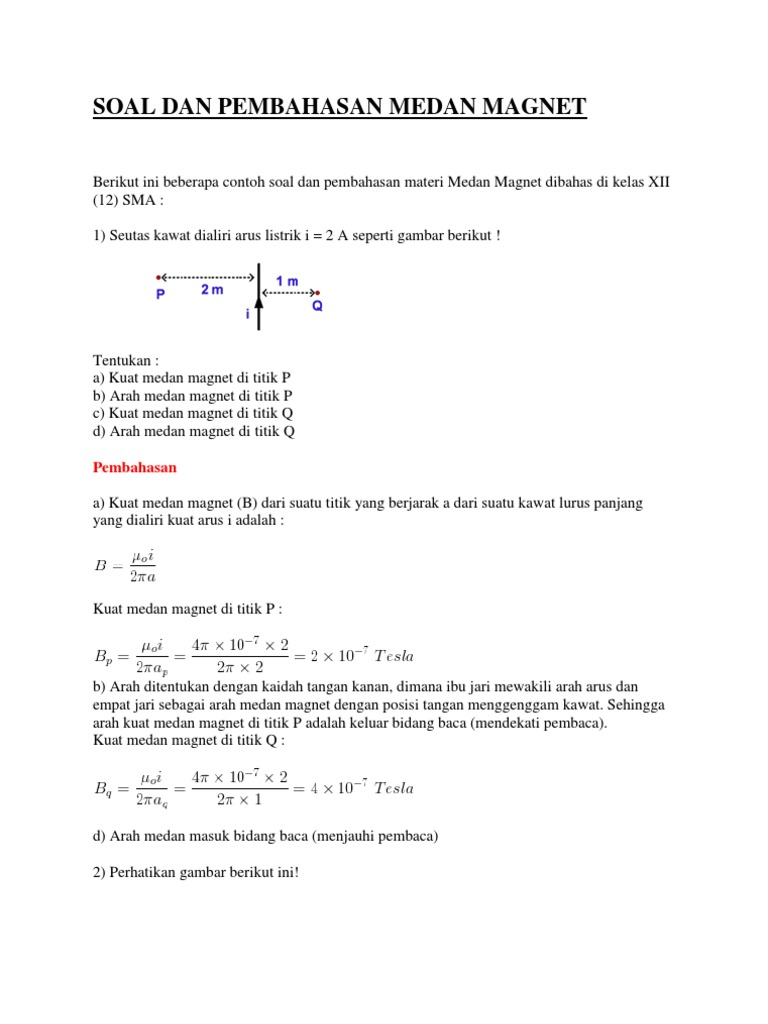 Soal latihan kemagnetan kelas 9 ini terdiri dari 15 soal yang dibagi dalam 2 tipe yaitu pilihan ganda dan soal esay. Soal fisika tentang medan magnet beserta jawabannya. Kali ini kita tidak hanya akan membahas beberapa contoh soal gaya lorentz, namun terlebih dahulu kita juga akan menjelaskan tentang gambaran materi. The document has been permanently moved to here. Jangan menyerah dengan fisika karena fisika tidak akan membunuhmu tetapi justru akan. Arus a akan menghasilkan medan magnet di titik p dengan arah masuk bidang, sementara arus b. 1 seutas kawat dialiri arus listrik i 2 a seperti gambar berikut.a kuat medan magnet di titik p b arah medan magnet di titik p c kuat medan magnet di titik q. Jelaskan apa yang dimaksud dengan medan magnet! Berikut ini , soal essay lks fisika tentang (medan magnet) kurikulum2013, beserta kunci jawabannya, untuk siswa sma/smk/ma/sederajat. Salah satunya adalah ketik suatu benda yang memiliki medan magnet berdekatan dengan sebuah penghantar yang mempunyai aliran listrik maka akan timbul gaya magnetik pada kawat yaitu gaya lorentz.