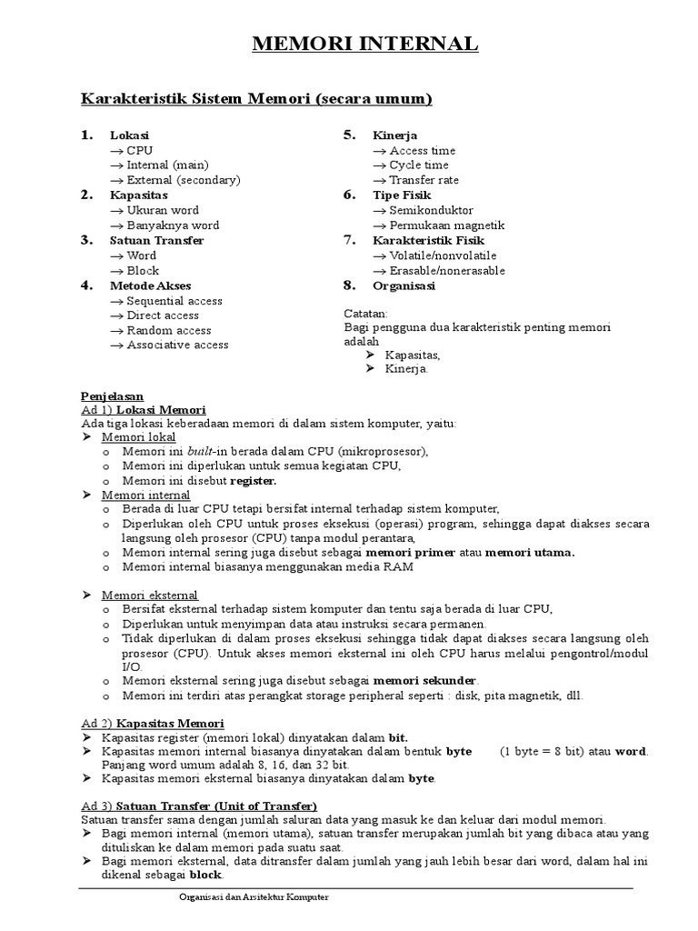 Memori adalah bagian dari system computer yang berfungsi untuk menampung/menyimpan data maupun program sementara pada komputer. Perlu diketahui, mungkin bagi sebagian orang berpikiran bahwa yang dinamakan penyimpanan itu hardisk, ya memang. Flash disk, yaitu memori yang menyimpan datanya di flash memori. Karakteristik memori sebagai kedalam beberapa jenis sesuai dengan beberapa kriteria. Contoh produk yang memakainya adalah 3dfx seri voodoo4. Memori eksternal atau memori sekunder adalah memori tambahan yang memiliki kapasitas besar. Memori internal memiliki fungsi sebagai pengingat. Ada 7 karakteristik sistem memori secara umum: Setiap lokasi di dalam memori utama memiliki alamat yang unik.