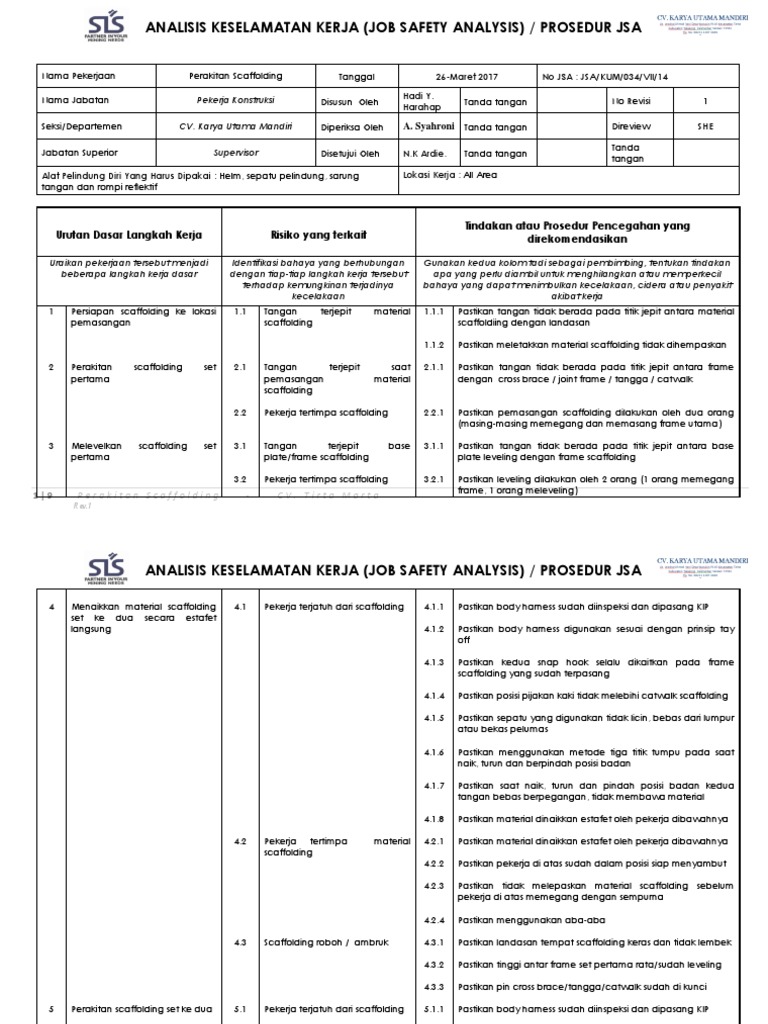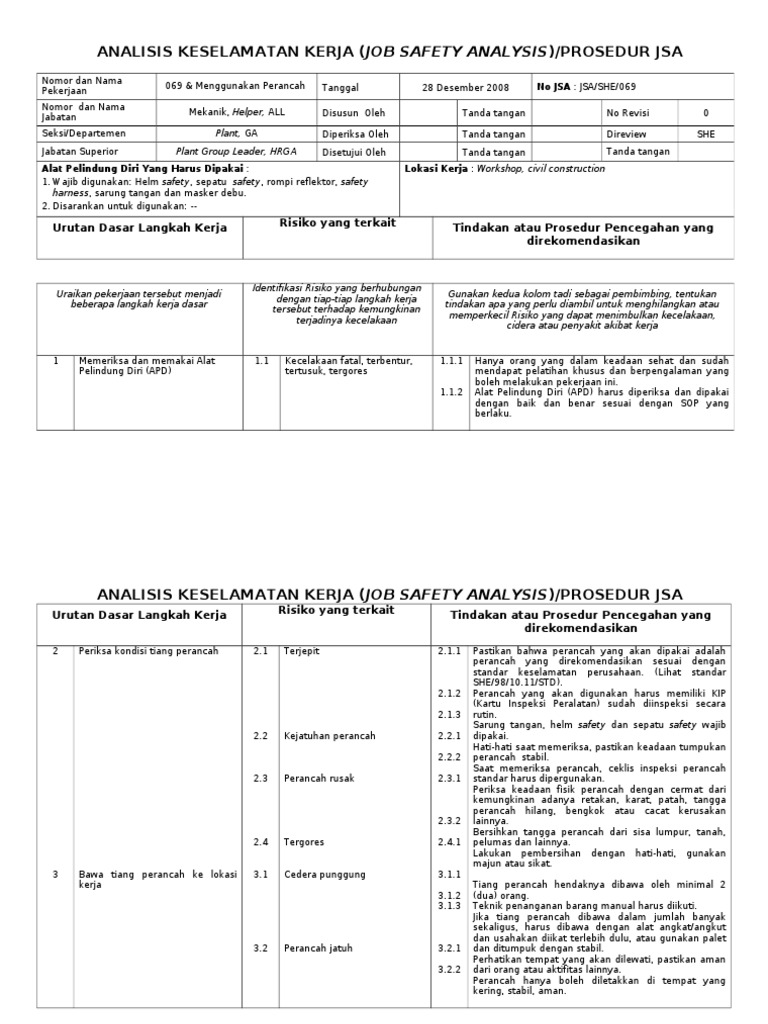 Peraturan menteri ketenagakerjaan no 9 tahun 2016 yang mengatur. Kepala biro umum dan keuangan, drs. R = 0,447) dan komunikasi (p. Contoh sop perusahaan beserta format standarnya. Manfaat s.o.p kerja bagi karyawan dan perusahaan. Izin bekerja di atas ketiggian diperlukan untuk melakukan pekerjaan yang berada pada ketinggian lebih dari 1.8 meter. 9 november 2014 tipe peralatan yang digunakan untuk bekerja di ketinggian a,l : Contoh jsa bekerja di ketinggian. Job safety analysis (jsa) pengelasan.
