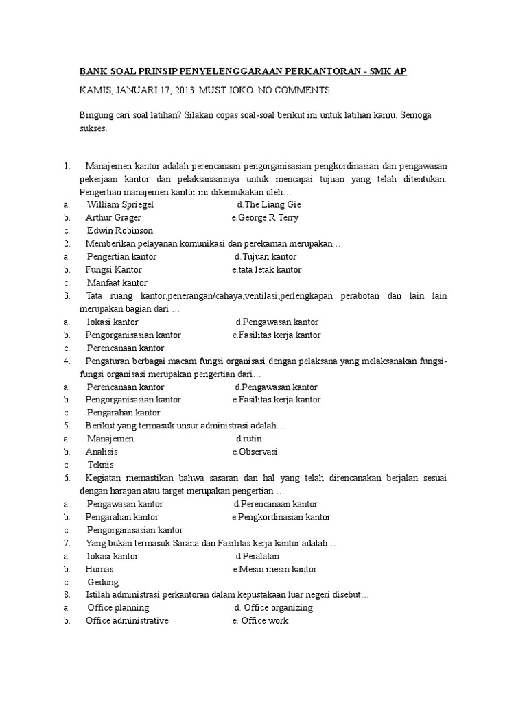 Dengan soal soal administrasi beserta kunci jawaban nya menambah ilmu dari sodara sodara sekalian. Administrasi umum x, bab 1 kumpulan soal pilihan ganda dan kunci jawaban administrasi umum x tentang kegiatan administrasi perkantoran. Mata pelajaran tersebut yaitu administrasi infrastruktur jaringan. Soal administrasi pajak kelas xi smk ini bisa digunakan sebagai bahan latihan dalam persiapan uas ganjil ataupun penilaian akhir semester. Lingkungan bisnis hukum perpajakan 1 jika diketahui tingkat suku bunga domestik sebesar 13 dan tingkat suku bunga luar negeri sebesar 10 maka berdasarkan interest parity condition a. Soal pilihan ganda administrasi umum beserta jawaban mei 12, 2021 posting komentar klik disini. Contoh soal akm literasi lengkap free download. Soal uts pilihan ganda administrasi umum beserta jawaban. Soal dan jawaban hukum lingkungan.
