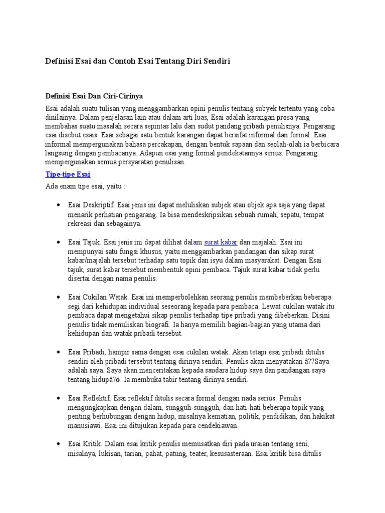 Biasanya essay ini dibuat ketika ada permintaan tertentu, seperti sebagai salah satu syarat untuk melamar magang atau pekerjaan di suatu instansi. Meski masih nganggur, sedulur tetap harus percaya diri dan optimis seperti ini. Contoh essay tentang diri sendiri. Essay diskripsi diri sendiri (ismanto) nama saya ismanto. Awalnya aku masih belum tau pasti arti nama yang diberikan oleh orang tuaku, tetapi mereka bilang arti namaku adalah “anak baik dan setia yang terakhir” dan terkadang. Esai tentang kelemahan dan kelebihan pada diri sendiri esai tentang kelemahan dan kelebihan pada diri sen essay diskripsi diri sendiri contoh essay tentang diri sendiri. Saya memiliki adik kandung yang bernama khairani molek, sekarang adik kandung saya sekolah dasar negeri japura, riau. 07.02.2017 · contoh esai tentang diri sendiri berikutnya adalah contoh esai/essay singkat tentang diri sendiri nama saya abdul malik. Contoh esai tentang diri sendiri bahasa indonesia terbaru esai merupakan seatu bentuk tulisan yang mendeskripsikan opini atau pandangan subyektif terhadap suatu hal.