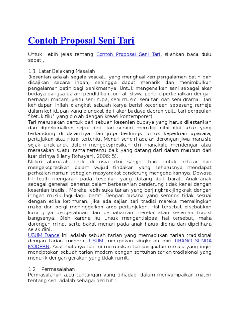 Alhamdulillah, segala puji bagi allah, tuhan yang maha esa. Contoh proposal pagelaran seni musik contoh proposal p agelaran. 1.1 latar belakang masalah (kesenian adalah segala sesuatu yang menghasilkan pengalaman batin dan disajikan secara indah, sehingga dapat menarik dan menimbulkan pengalaman batin bagi penikmatnya. Skripsi yuk adalah jasa pembuatan skripsi pendidikan seni tari. Seni merupakan suatu yang tidak dapat di pisahkan dari kehidupan manusia sebagai makhluk yang penuh imajinasi. Kegiatan pementasan seni terdiri dari beberapa kegiatan, yakni sebagai berikut contoh proposal pagelaran seni tari kelas 12. Latar belakang dalam rangka memperingati hari pendidikan dengan adanya acara tersebut, kreasi dan. Pentas seni kelompok 3 kelas ix b smp n 5 kota jambi. Proposal pagelaran seni tari pdf.