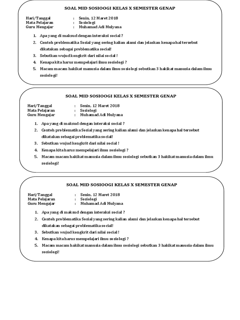 Berikut, contoh soal uas sosiologi kelas xii semester 1 beserta jawabannya untuk siswa sma/sederajat. Soal sosiologi kelas xii semester 2 selasa, 24 desember 2013. Demikianlah soal dan kunci jawaban pts/uts sosiologi kelas 12/xii sma/ma/smk semester 2 kurikulum 2013 yang dapat kami bagikan, semoga bermanfaat untuk kita semua. Sosiologi sma kelas 12 ips. Prosedur penelitian dan rancangan penelitian. Dalam rangka memperdalam pemahaman tentang sosiologi khususnya di kelas 12. Dan bisa juga menjadi acuan atau bahan guru guru dalam membuat soal. Sikap pasrah terhadap nasib, kurang disiplin, tidak jujur, serta pemboros merupakan…. Peserta didik perlu mempersiapkan diri dalam menghadapi pts 2 tahun pelajaran 2021/2022, salah satu caranya adalah dengan cara mempelajari latihan soal.