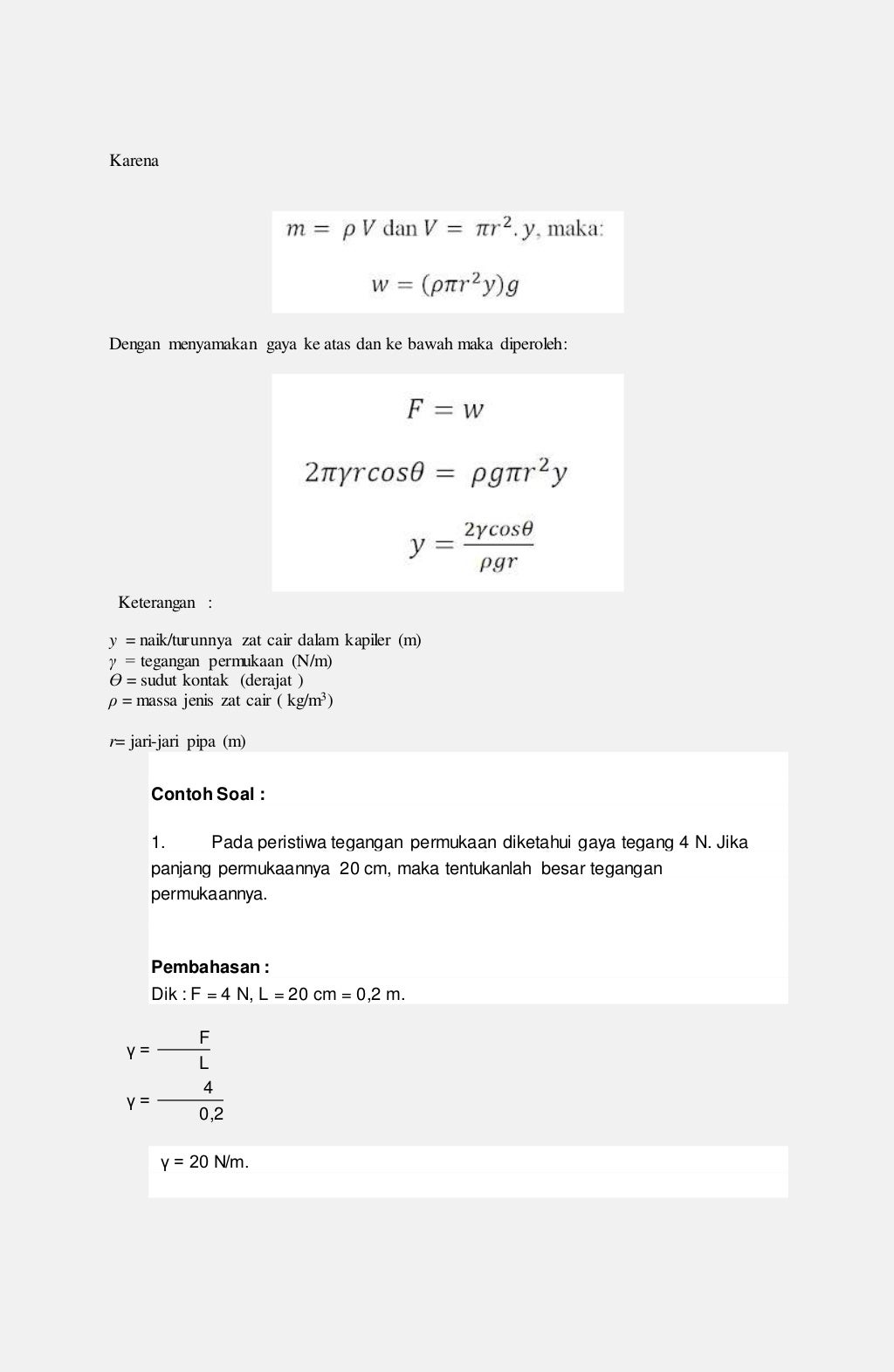 Pdf bab 5 integral lipat dan penggunaannya ivan arzaqi. Kemudian, kawat kecil pq yang bermassa 0,2 gram dipasang dalam kawat tersebut. Soal dan pembahasan tegangan permukaan posted by edutafsi on 02 april 2015 1011 pm tegangan permukaan zat cair adalah suatu kecenderungan permukaan zat cair untuk meregang sehingga seperti ditutupi oleh suatu lapisan elastis. Tegangan permukaan, meniskus dan kapilaritas tegangan permukaan (γ) dalam larutan sabun didefinisikan sebagai perbandingan antara gaya tegangan permukaan (f) dan panjang permukaan (d) dimana gaya itu bekerja. Besar tegangan permukaan γ akan besar jika gaya permukaan f diperbesar, namun besar tegangan permukaan γ akan kecil jika panjang permukaan l diperbesar. Tegangan permukaan air 0,07 n/m. Pada kejadian tegangan permukaan diketahui gaya tegang 4 n. Soal dan pembahasan tegangan permukaan posted by edutafsi on 02 april 2015 10 11 pm tegangan permukaan zat cair adalah suatu kecenderungan permukaan zat cair untuk meregang sehingga seperti ditutupi oleh suatu lapisan elastis. Buih sabun mempunyai permukaan yang luas, sehingga mampu mengemulsikan kotoran yang melekat pada benda yang dicuci.