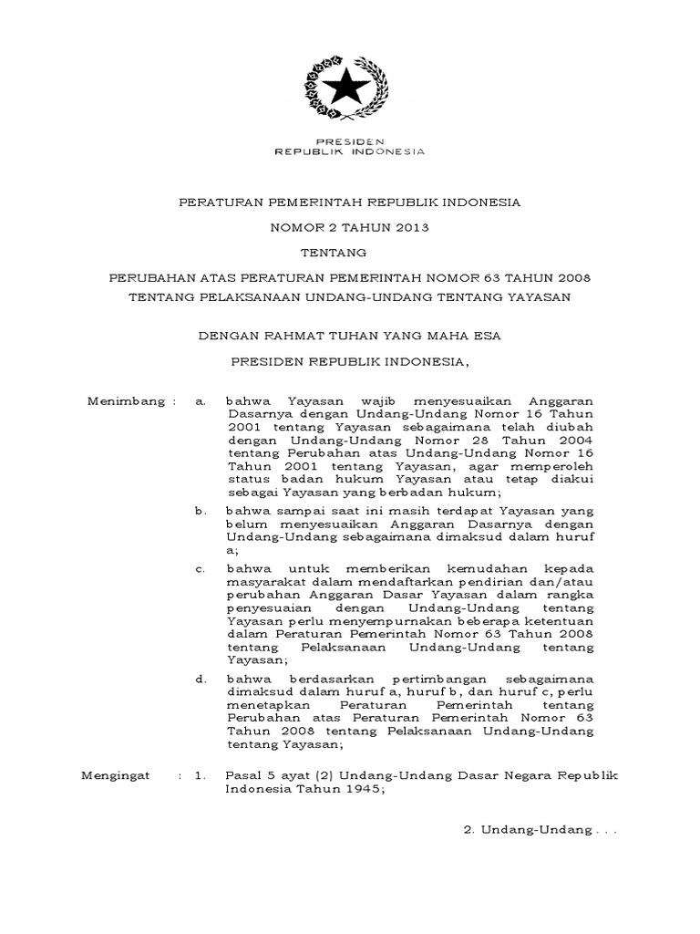 Bersamaan dengan perubahan pengurus yayasan, nama yayasan yang mengelola lembaga pendidikan kami diubah namanya dari a ke b. Padahal perubahan susunan pengurus bukanlah merupakan perubahan anggaran dasar dan tidak ada ayat 2 dalam pasal 20 tersebut. Pasal 24 ayat (4) dan (5) tentang masa jabatan anggota kepengurusan. S e b e l u m d o w l o a d b a c a d u l u : Contoh akta pendirian yayasan menjadi hal penting yang harus diketahui sebelum mendirikan yayasan.yayasan sendiri adalah sebuah badan hukum yang mempunyai tujuan agama, social dan kemanusiaan. Academia edu is a platform for academics to share research papers. Permohonan persetujuan perubahan anggaran dasar pada ayat (2) diajukan kepada menteri, dalam jangka waktu paling lama 60 hari terhitung sejak akta perubahan dibuat. Pasal 9 ayat (2) tentang tugas dan kewenangan pembina; Tugas dan wewenang pembina pengawas pengurus.