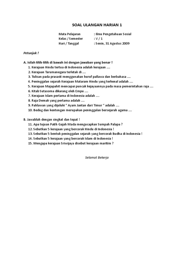 60+ contoh soal dan jawaban sejarah indonesia kelas 10 semester 1 kurikulum 2013 (essay lengkap) dimulai dari pertanyaan nomor 41, berikut dibawah ini soal pg sejarah indonesia kelas 10 semester ganjil dilengkapi kunci jawaban. Berikut ini kami kumpulkan soal dan kunci jawaban tentang materi kerajaan singasari yang bisa anda baca untuk lebih mudah memahami materi kerajaan singasari. Soal tentang menghargai peran tokoh pejuang. Berikut ini soal dan kunci jawaban tentang kerajaan singasari yang biasanya tersedia pada mata pelajaran sejarah untuk smp, sma ataupun smk. Program belajar dari rumah merupakan program baru garapan. B) airlangga juga berupaya memberikan kemakmuran bagi rakyatnya. Kerajaan bali runtuh disebabkan siasat yang dilakukan oleh patih gajah mada yang pada saat sedang melakukan perrluasan wilayah ekspansinya ke nusantara. Sejak pertama kali didirikan, kerajaan ini diperintah oleh beberapa. Pemerintahan puncak diserahkan kepada empat orang maha menteri.