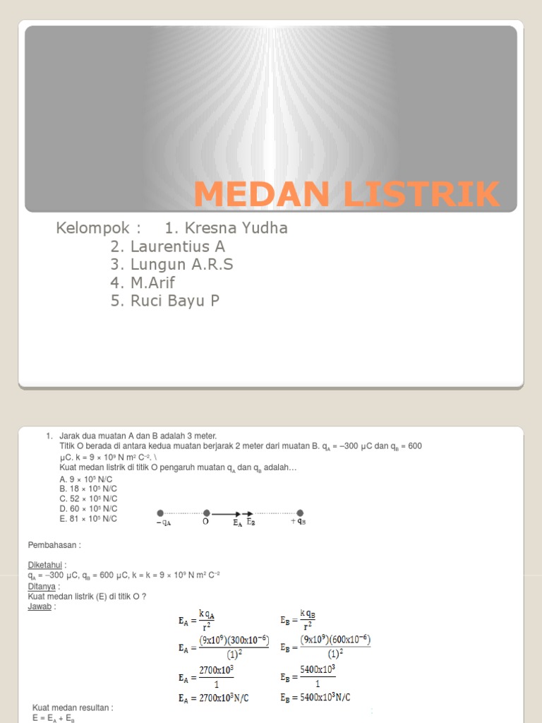 Soal Soal Medan Listrik. Soal penerapan rumus medan listrik pada susunan membentuk sudut. Agar anda bisa lebih lancar dalam menyelesaikan soal listrik statis, mari langsung saja kita bahas beberapa contoh soal listrik statis beserta jawaban dan pembahasannya di bawah ini. Medan listrik adalah daerah disekitar benda bermuatan listrik yang masih dipengaruhi oleh gaya listrik, dirumuskan e = f/q, di mana (f) adalah gaya coulomb dan (q) adalah besar muatan uji. E = k (q1 / r12 + q2 / r22) 2. Soal dan pembahasan hukum coulomb dan medan listrik (muatan titik sistem muatan terdistribusi diskrit dan kontinu) 1. A = sisi x sisi. Resultan medan listrik tak segaris. Apabila gaya yang bekerja pada muatan uji sebesar 0,6 n. Materi ipa kelas 9 smp kurikulum 2013. Contoh soal listrik statis dan jawabannya. Secara matematis, kuat medan listrik dapat dihitung dengan menggunakan rumus berikut. Contoh soal kuat medan listrik muatan segitiga sama kaki dan pembahasannya. Soal kapasitor dan penyelesaiannya 2. 5 √ 2 x 10 4 n/c. 2 √ 2 x 10 4 n/c.